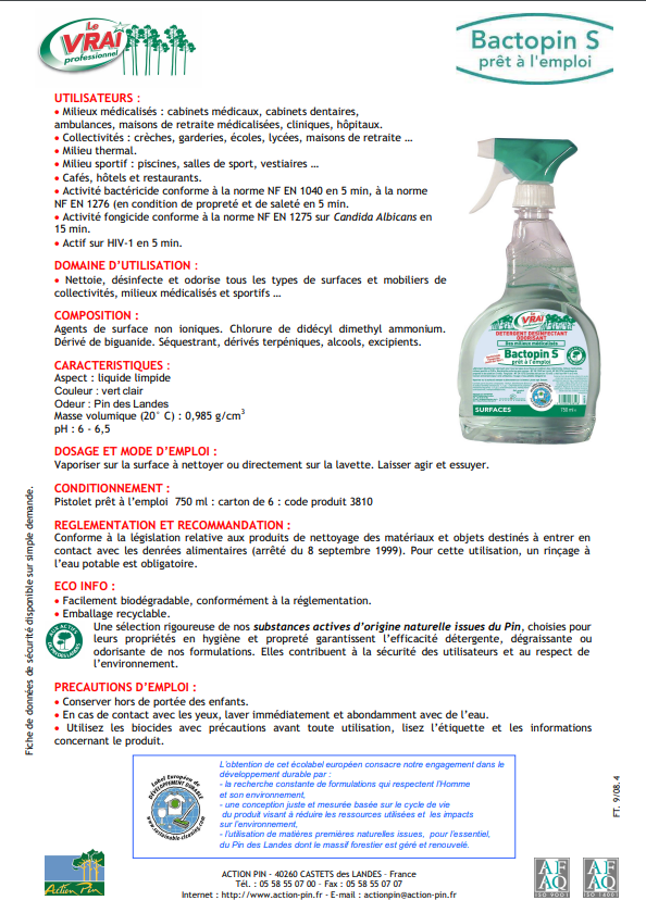 Détergent désinfectant professionnel écologique pour surfaces et matériels.