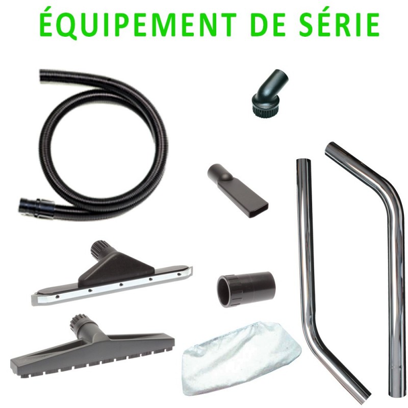 Équipement standard : tuyau flexible 5 m ø38 mm, tubes rallonge 2x50 cm ø38 mm, vanne inox double coude ø38 mm, suceur brosse ø38 mm, suceur eau ø38 mm, suceur biseau ø38 mm, brosse ronde ø38 mm, kit de filtration, filtre nylon
